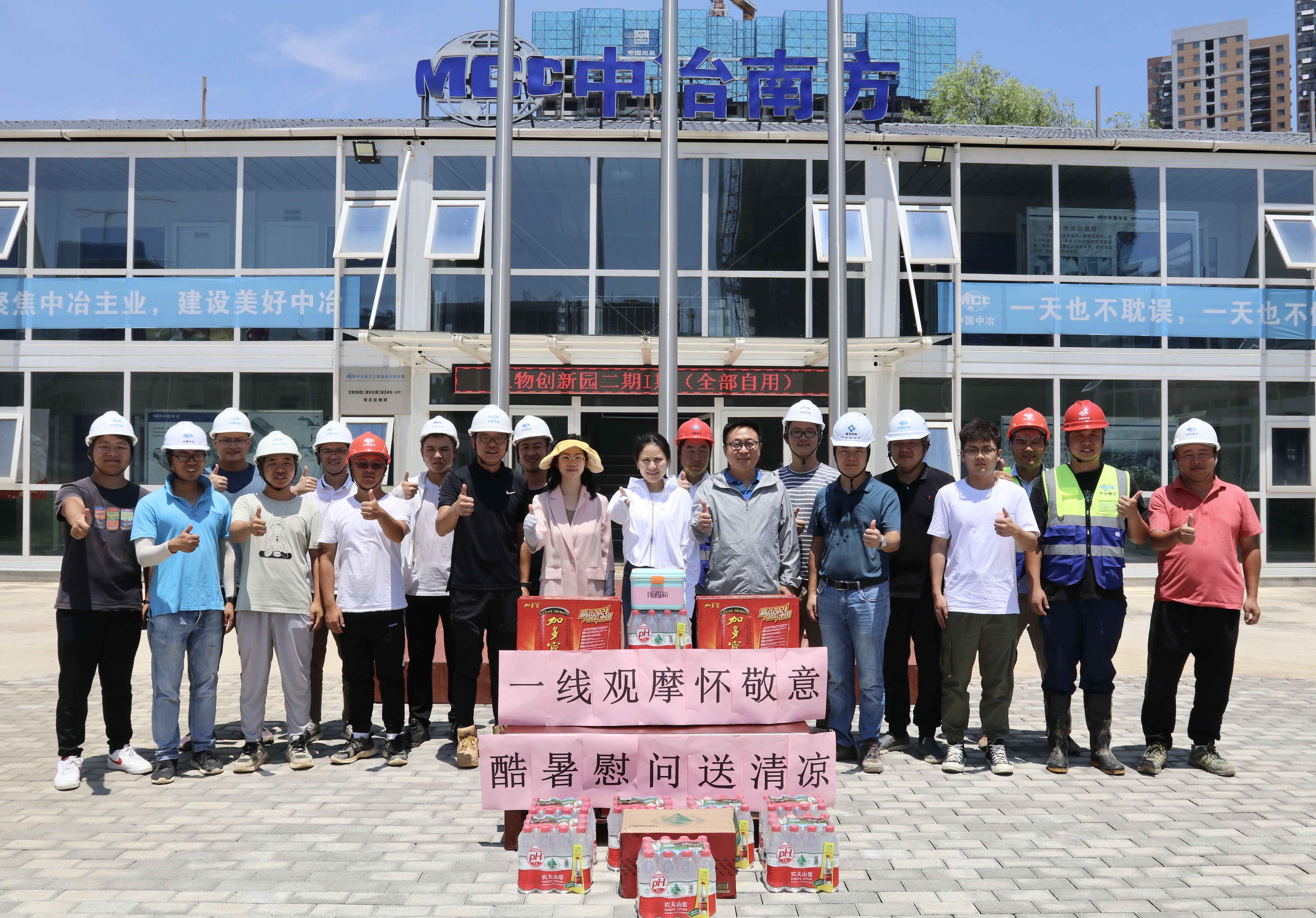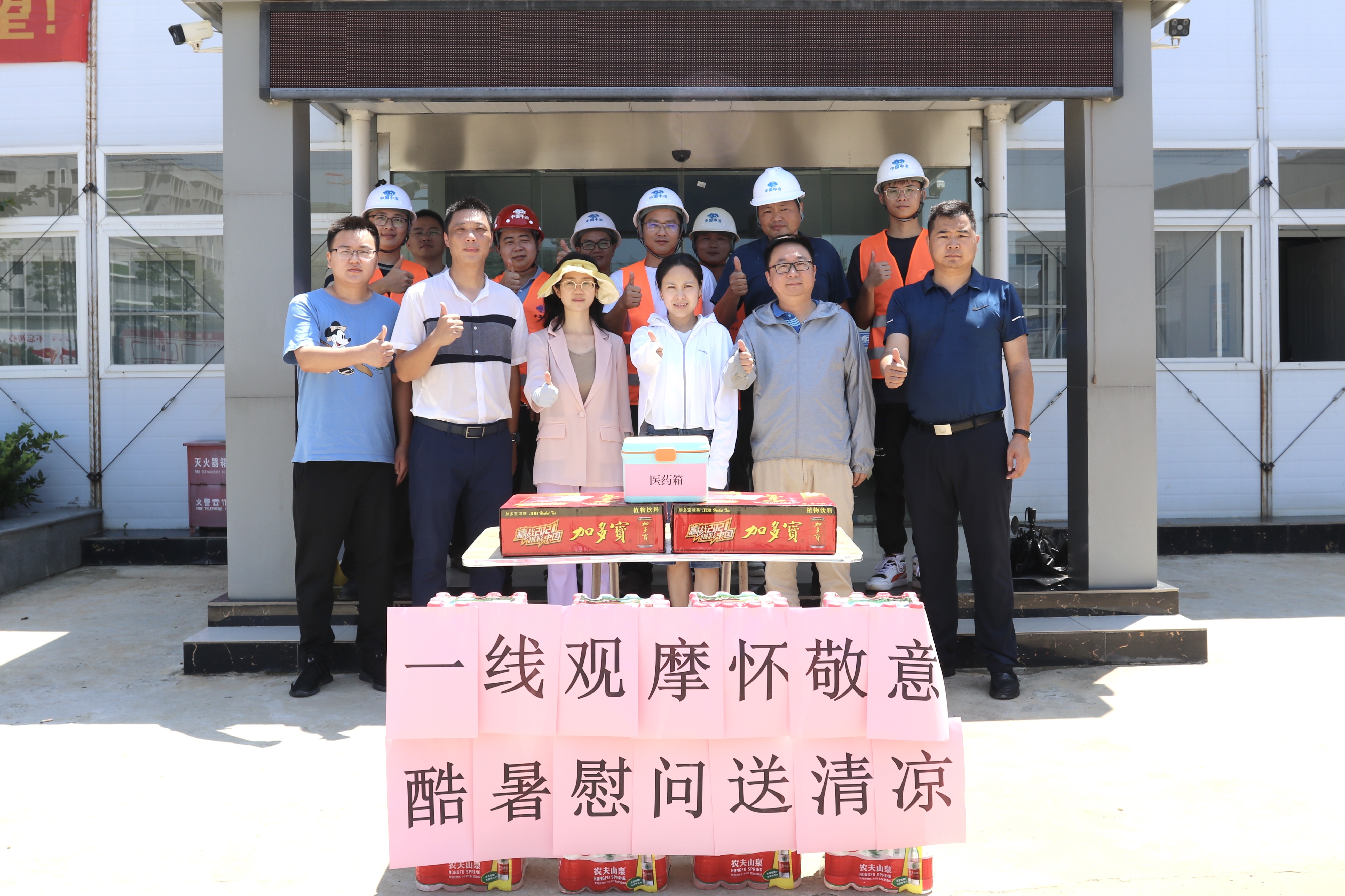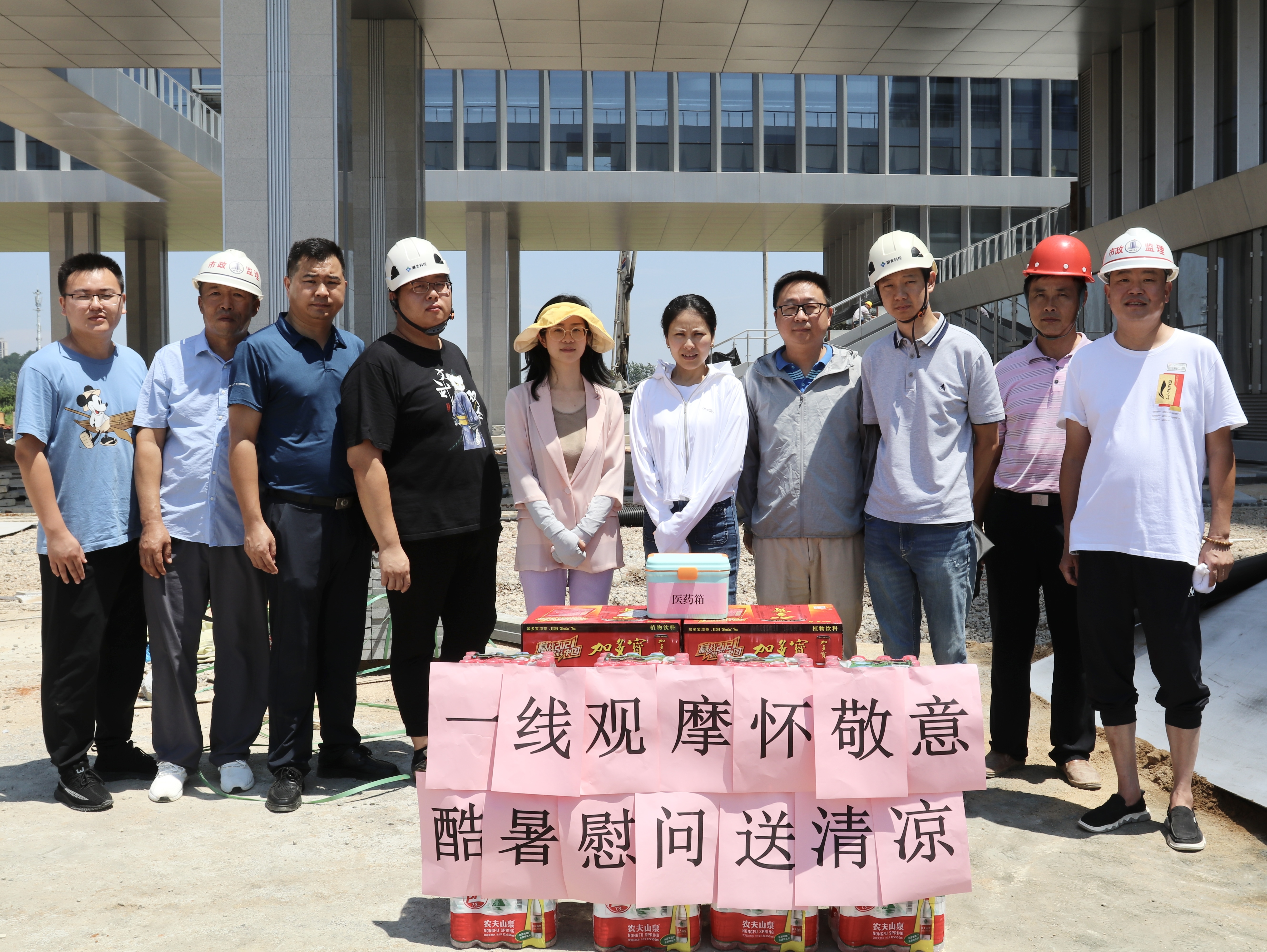整潔衛(wèi)生的施工場地、醒目的標(biāo)語標(biāo)識牌、文明安全的施工氛圍,都是每一個駐扎在項目現(xiàn)場的員工克服重重困難共同努力出來的結(jié)果。一句句關(guān)心的話語,一份份慰問的物品,讓一線駐場人員在酷暑中感受到無比清涼,在場的員工們紛紛表示將繼續(xù)堅守崗位,盡職盡責(zé),堅持不懈地迎戰(zhàn)高溫、抓進(jìn)度、保質(zhì)量、重安全,確保項目建設(shè)有序推進(jìn)。