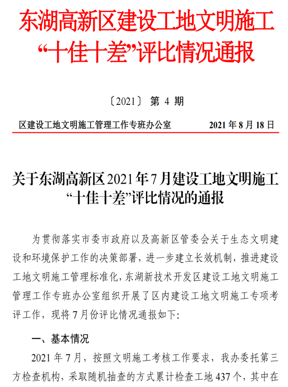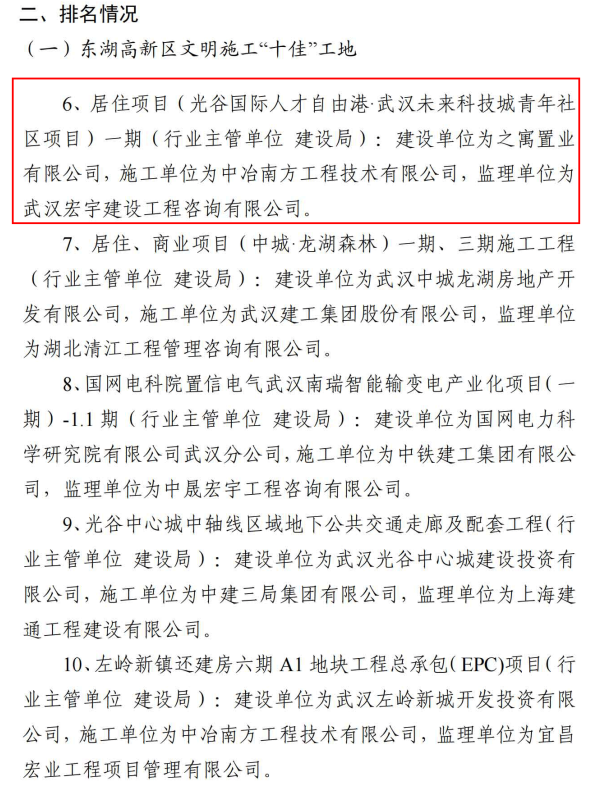 ? 根據(jù)東湖新技術(shù)開(kāi)發(fā)區(qū)建設(shè)工地文明施工管理工作專班辦公室組織開(kāi)展的區(qū)內(nèi)建設(shè)工地文明施工專項(xiàng)考評(píng),之寓未來(lái)(武漢未來(lái)科技城青年社區(qū))項(xiàng)目被評(píng)為2021年7月東湖高新區(qū)文明施工“十佳”工地。