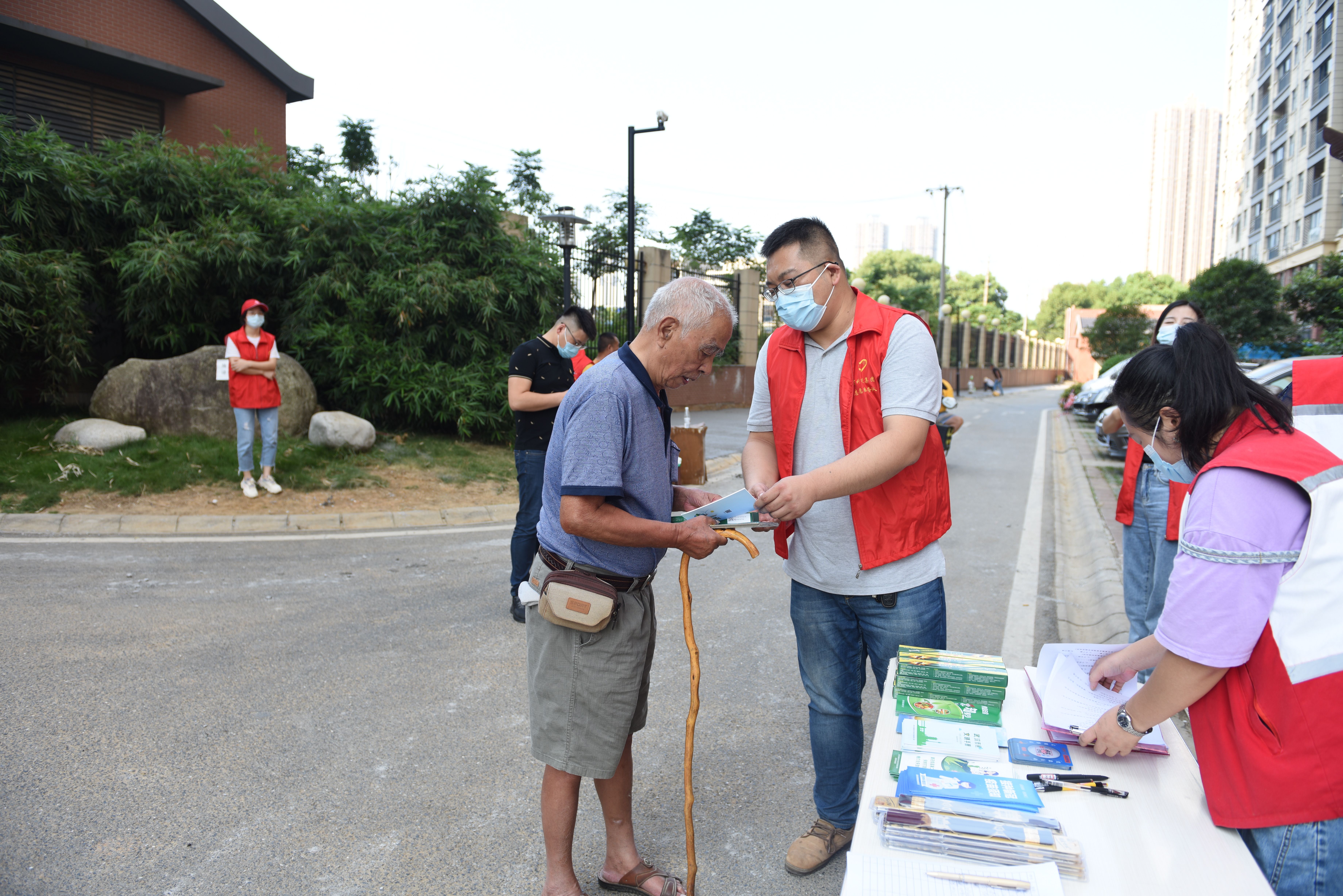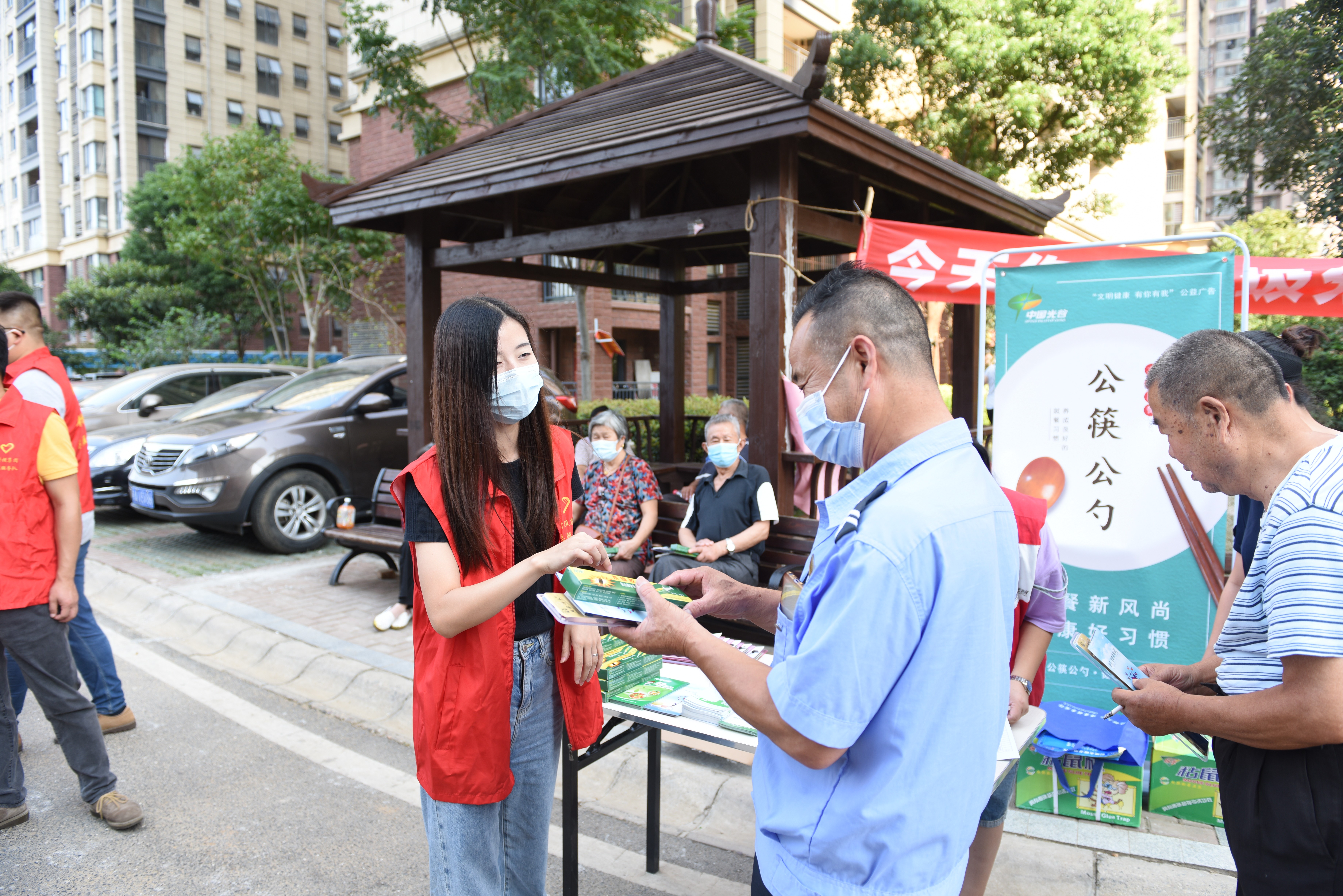 隨后,科投集團(tuán)青年黨員干部職工來(lái)到南湖錦城社區(qū)廣場(chǎng),和社區(qū)工作人員一起開(kāi)展“文明城市復(fù)審”志愿活動(dòng)。向社區(qū)居民宣傳垃圾分類、倡導(dǎo)公勺公筷、除四害防病媒傳播,并在現(xiàn)場(chǎng)為居民群眾發(fā)放公筷、除蟑膠餌和粘鼠板等物資。