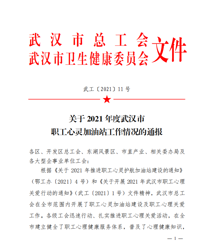 近日,武漢市總工會和武漢市衛(wèi)生健康委員會聯(lián)合發(fā)文通報了2021年度武漢市職工心靈加油站工作情況,產(chǎn)業(yè)園公司榮獲“2021年度武漢市職工心靈加油站”稱號!