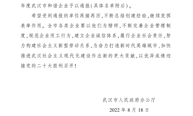 近日,武漢市人民政府辦公廳發(fā)布了《2021年度全市和諧企業(yè)創(chuàng)建工作情況的通報》,武漢光谷產(chǎn)業(yè)園建設投資有限公司繼榮獲武漢市和諧企業(yè)、職工心靈加油站稱號后,獲評“2021年度武漢市模范和諧企業(yè)”榮譽稱號。